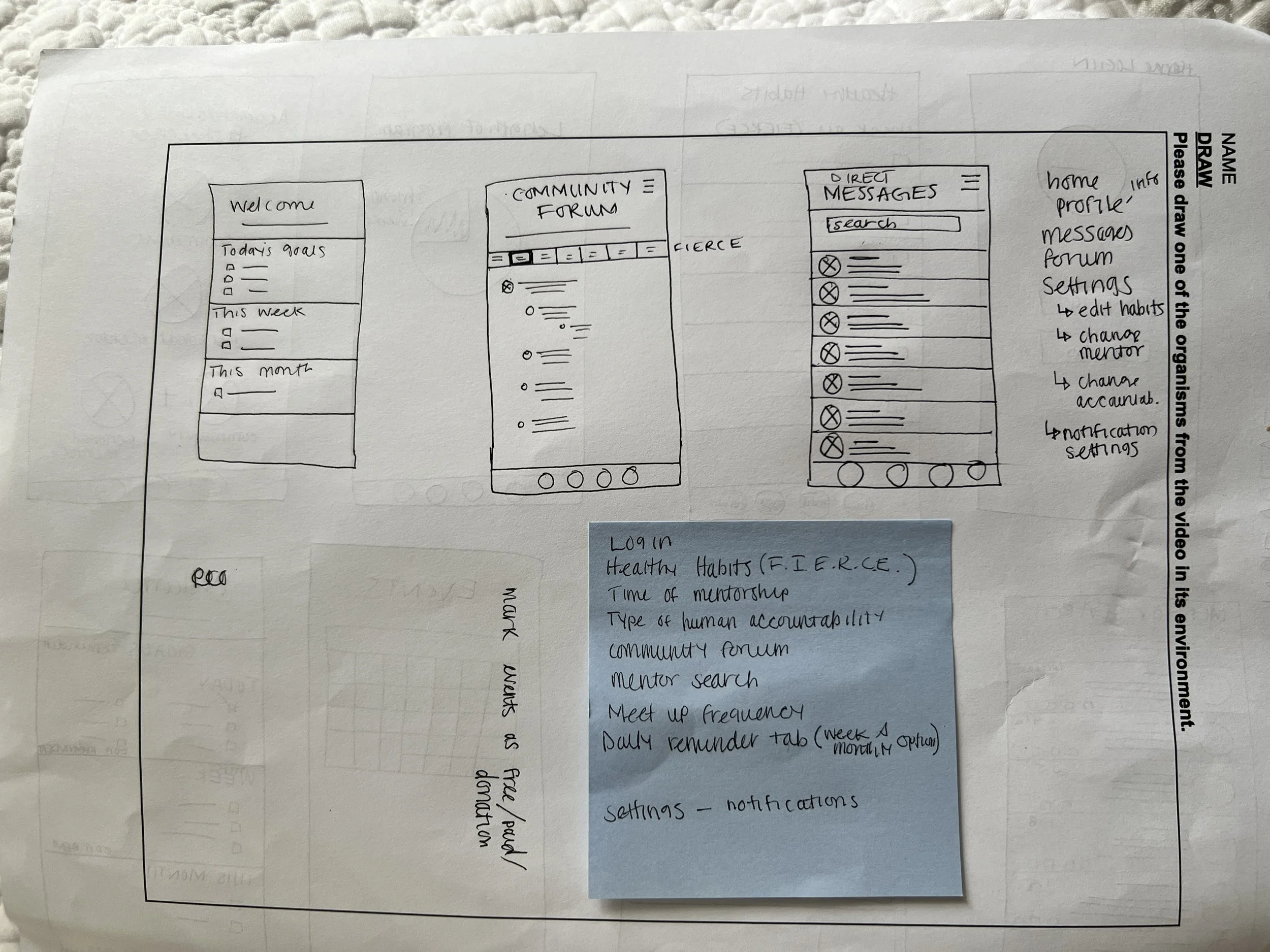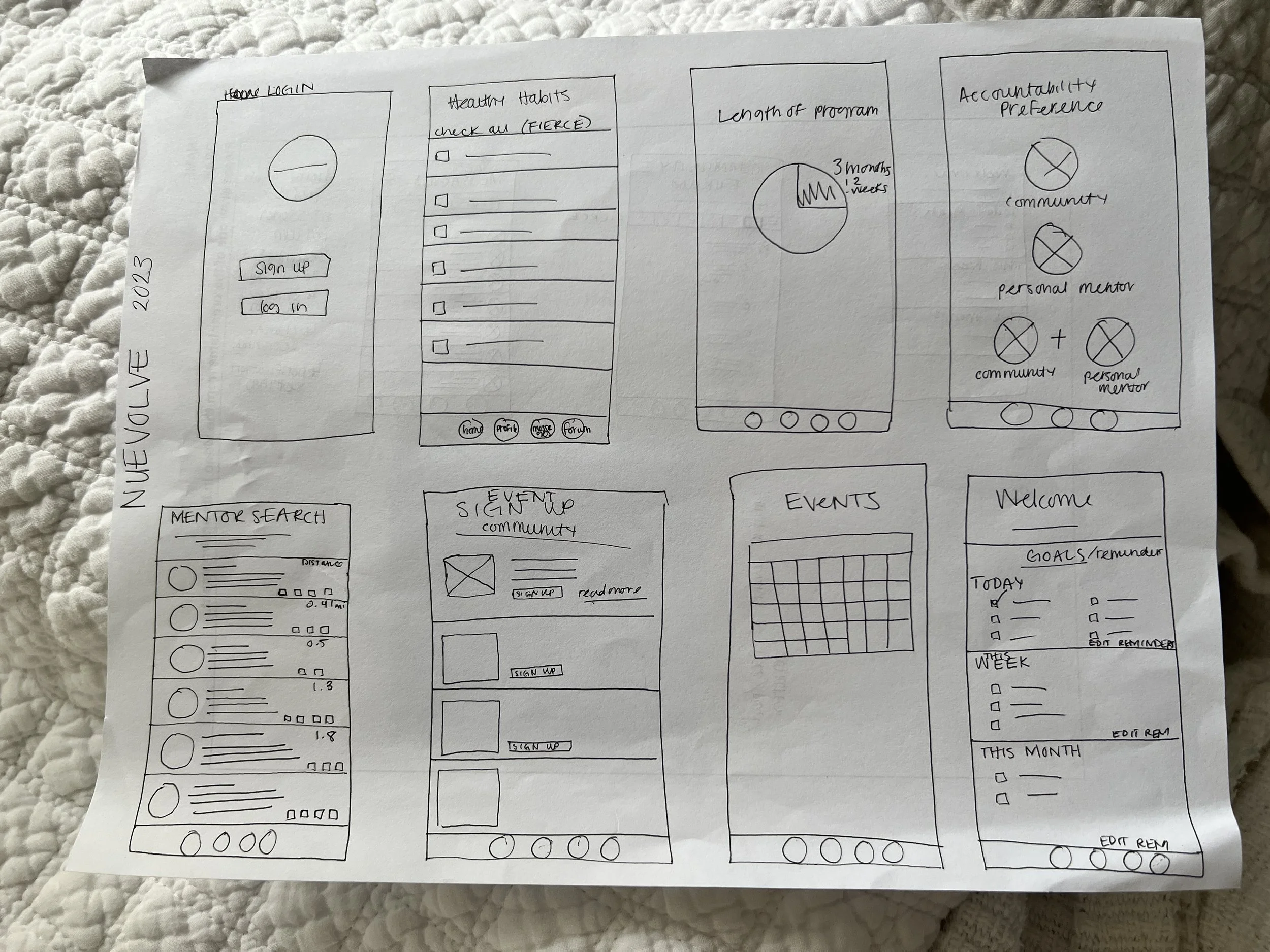 For the paper wireframes for the app, I used Crazy Eights to quickly ideate on the most important screens of the app. The app would be geared towards finding a mentor, but mostly keeping track of the healthy habits the user wanted to form. I eventually made more paper wireframes of the screens as I realized that there would be more to the user journey.