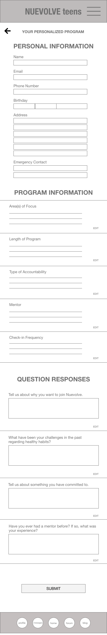 The Goal: The Nuevolve app will allow users to find like-minded community and mentors that will help them develop and cultivate healthy habits. Users will be able to connect with mentors and communities in-app and in person via events. Users will have access to a forum, blog, and a personalized daily checklist.